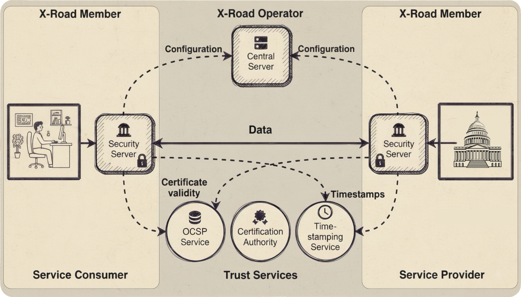 Every data exchange is encrypted end-to-end. Every query requires authentication. Every access is logged and auditable. Unlike centralized databases that create single points of failure, X-Road distributes data across agencies while maintaining iron-clad security. Even if one system is compromised, the damage is contained.